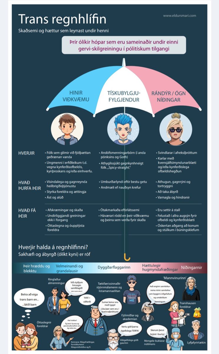 Ķ žvķ felst, hjį samtökunum, aš nota orš eins og kynvitund (sem vķsar ekki til kynfęra) og er eitthvaš töfraorš fyrir óstöšug börn til aš tślka eigin kyntjįningu, menn geti sér til um kyn, kynin eru fleiri en tvö o.s.frv. Ósannindi.